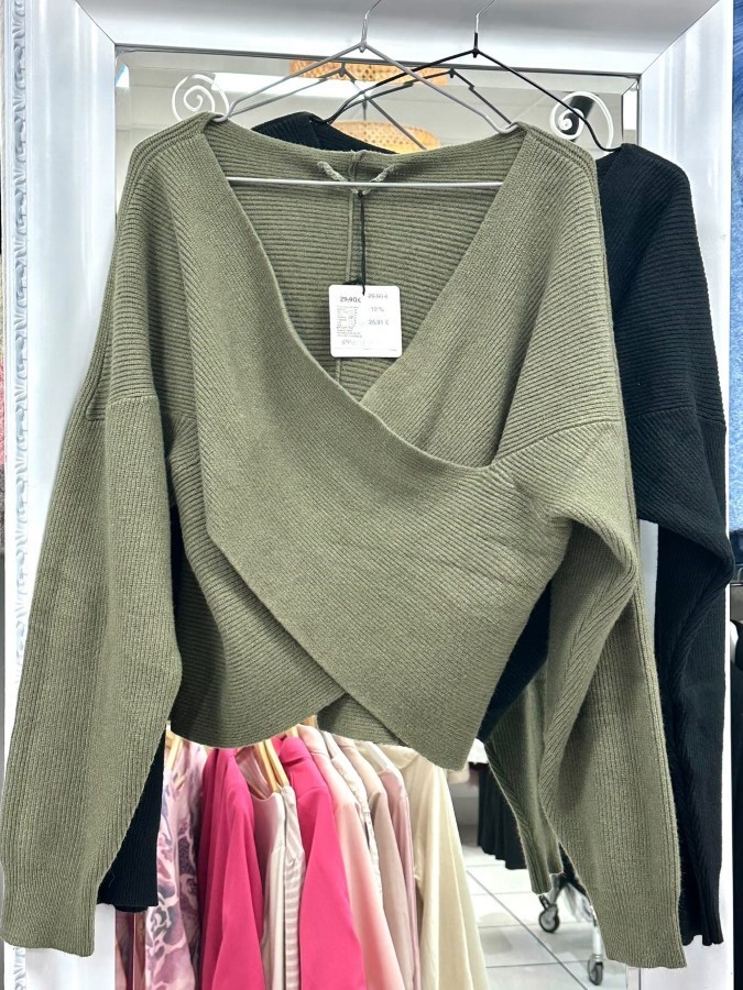 Udoben in eleganten pleteni pulover s sodobnim preklopnim videzom in ženstvenim V-izrezom. Rahlo oversized kroj poskrbi za sproščen videz, medtem ko mehka pletenina nudi toplino in udobje. Na voljo v več barvah – idealen za kombiniranje z jeansom, krili ali elegantnimi hlačami.