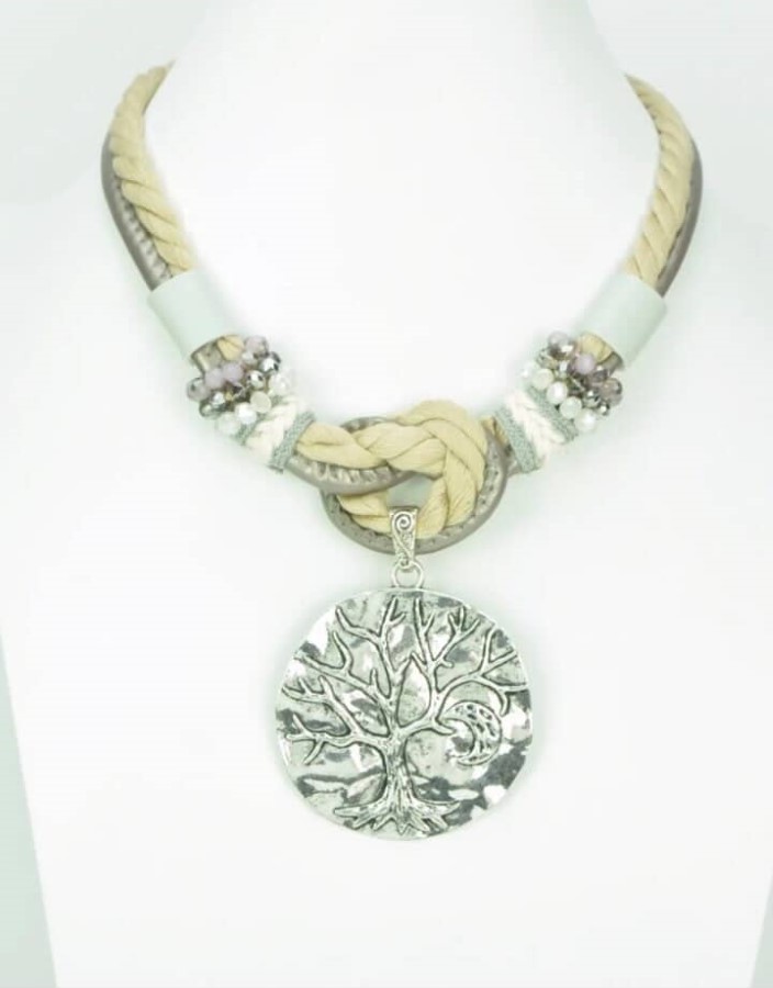 Ogrlica je sestavljena iz pletenih tekstilnih vrvic v nežnem krem odtenku. Na sredini jo dopolnjuje velik okrogel kovinski medaljon z reliefnim motivom drevesa. Detajli so poudarjeni s kovinskimi elementi v srebrnem tonu ter drobnimi okrasnimi perlami. Zapenjanje je kovinsko in stabilno.