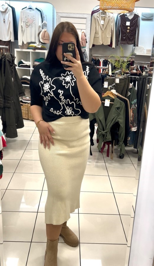 Mehko, udobno in ženstveno – pleteno krilo je popoln kos za hladnejše dni. Z rahlo raztegljivo strukturo lepo objame postavo in omogoča brezskrben, a urejen videz. Idealno za kombiniranje s puloverji, škornji ali elegantnim plaščem.