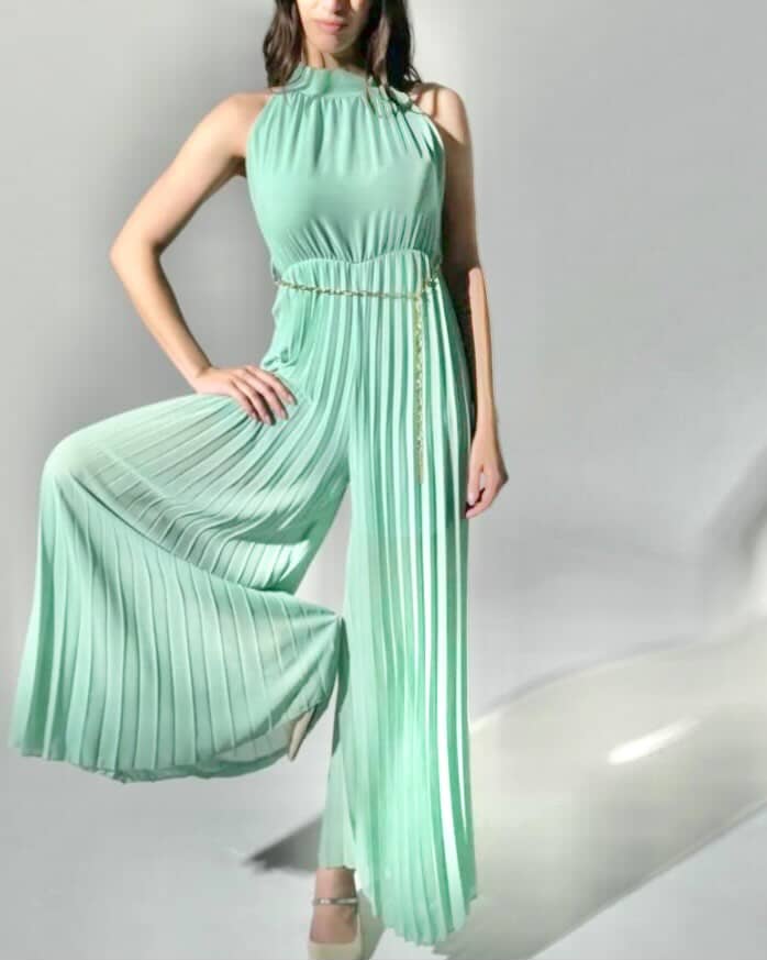 Lahkoten kombinezon iz plisiranega materiala nudi udobje in zračen občutek. Visok ovratnik in poudarjen pas ustvarita prefinjeno obliko. Široke hlačnice poskrbijo za eleganten padec blaga. Idealen je za sodoben in sproščen stil.