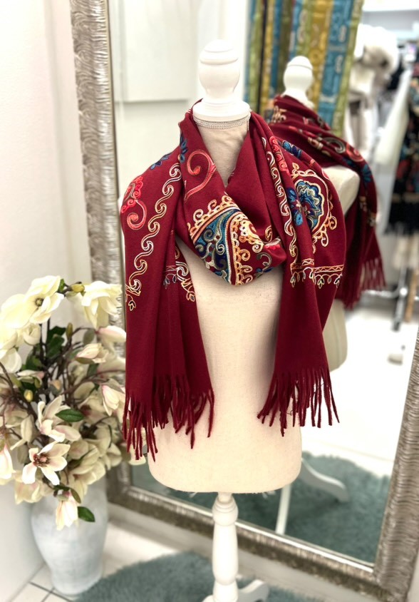 Elegantna izbira za vsak dan – rdeč šal z vzorci združuje klasično barvo in subtilno izražen dizajn. Mehka, lahkotna tkanina lepo pade in se udobno nosi, vzorci pa dodajo ravno pravšen poudarek, ki šal loči od običajnih enobarvnih modelov. Odličen za poslovne ali sproščene stilske kombinacije.
