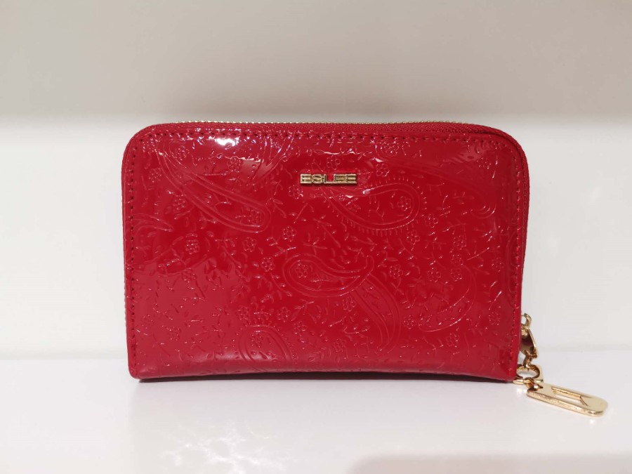 Elegantna rdeča denarnica je izdelana iz kakovostnega lakiranega umetnega usnja z nežnim reliefnim vzorcem. Sijajna površina poudarja prefinjen videz in zagotavlja večjo odpornost proti vlagi. Material je trpežen, enostaven za čiščenje in prijeten na otip.