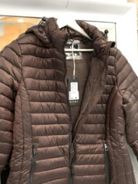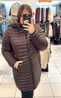 Topla, podložena ženska bunda v čokoladno-rjavem odtenku. Ima odstranljivo kapuco z elastiko za popolno prileganje in praktične žepke na zadrgo.
