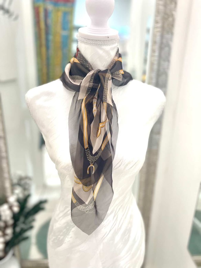 Prefinjen šal z elegantnim vzorcem v črno-bež odtenkih z zlatimi detajli doda vsakemu videzu pridih razkošja. Lahkoten in mehak material lepo pade ter omogoča različne načine nošenja – okoli vratu, zavezano v pentljo ali kot okras na torbici. Klasičen vzorec s subtilnimi verižicami ustvarja brezčasen in sofisticiran videz. Popolna izbira za poslovne priložnosti ali večerne izhode.