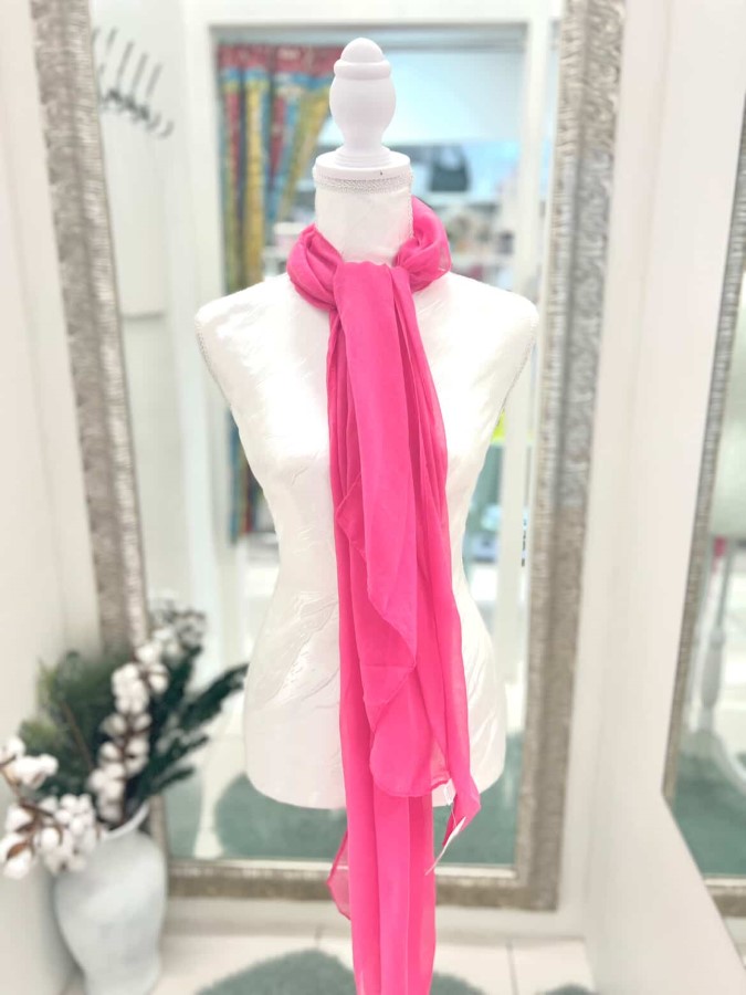 Lahek in zračen šal v živahni roza barvi je popoln dodatek za popestritev vsake modne kombinacije. Njegov mehak in tekoč padec ustvari eleganten videz, primeren za posebne priložnosti ali vsakodnevno nošenje. Lahko ga nosite okoli vratu, kot okras k obleki ali sproščeno ogrnjenega čez ramena. Prijeten material zagotavlja udobje in lahkotnost skozi ves dan.