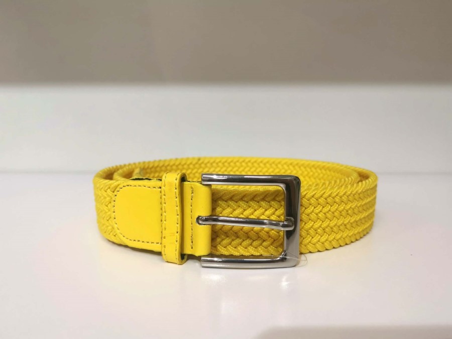 Živahen rumeni pas popestri vsakodnevne in elegantne kombinacije. Elastično pletenje omogoča prilagodljivo zapenjanje in udobno prileganje brez klasičnih lukenj. Kovinska zaponka v srebrnem videzu poskrbi za moderen videz in zanesljivo zapiranje. Idealen je za nošenje k jeansu, chino hlačam ali poletnim oblekam.