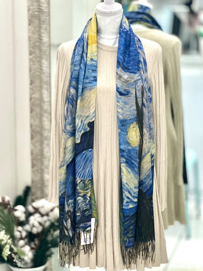 Ta šal, ki je natisnjen z motivom Van Goghove umetniške mojstrovine “Zvezdna noč”, je popoln dodatek za ljubitelje umetnosti in vse, ki želijo svojemu stilu dodati edinstven in kreativen pridih. Žive barve in prepoznavni vzorci na šalu prinašajo občutek gibanja in energije, medtem ko mehka tkanina zagotavlja udobje in toplino. Robovi s frufruji zaključujejo dizajn in dodajajo dinamičnost. Ta šal bo vsekakor pritegnil poglede in popestril vaš videz, ne glede na priložnost.