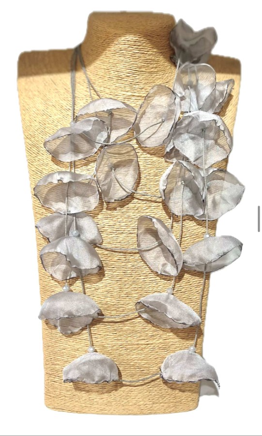 Ta nežna ogrlica združuje satenaste cvetove in majhne perlice, ki ustvarijo eleganten, skoraj sanjski videz. Zasnova je lahkotna in zračna, primerna za romantične priložnosti ali kot subtilen dodatek k vsakodnevnim oblačilom. Ročno izdelana z natančnostjo, zagotavlja občutek sofisticiranosti in edinstvenosti.