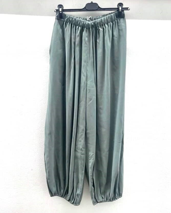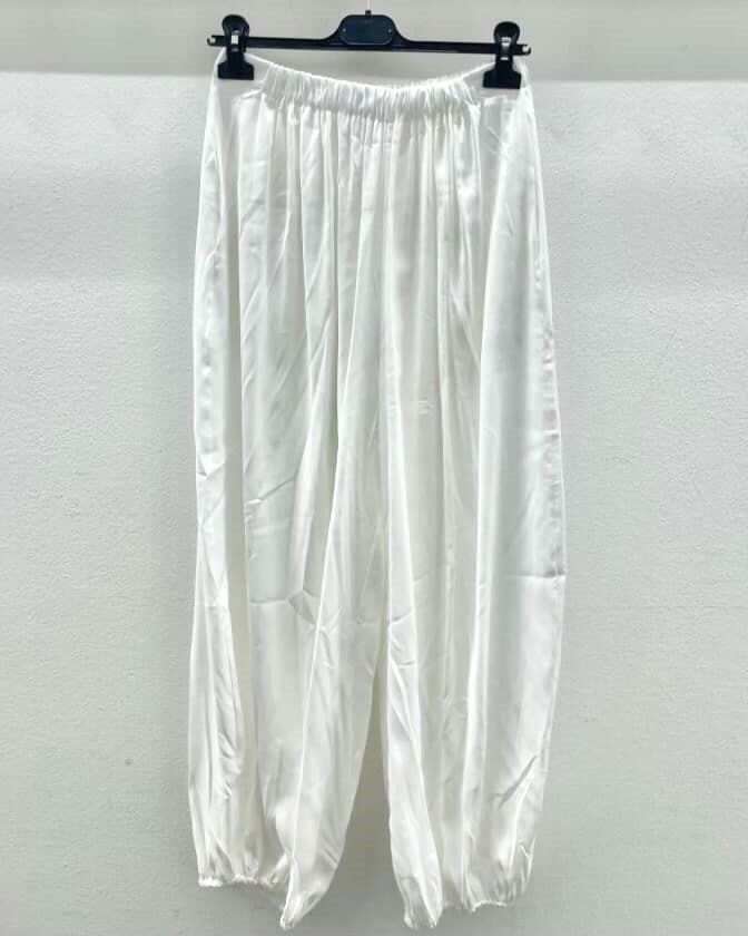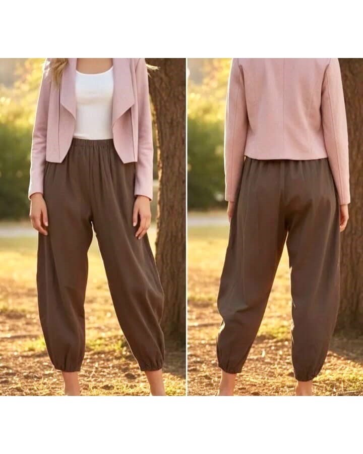 Te hlače so popolna kombinacija udobja in stila. Zračne in lahke, so idealne za vsakodnevno nošenje, saj nudijo popolno svobodo gibanja, medtem ko ohranjajo eleganten videz. Elastika na robu hlačnic omogoča, da se prilagodijo telesu in dodajo pridih sodobnega stila.