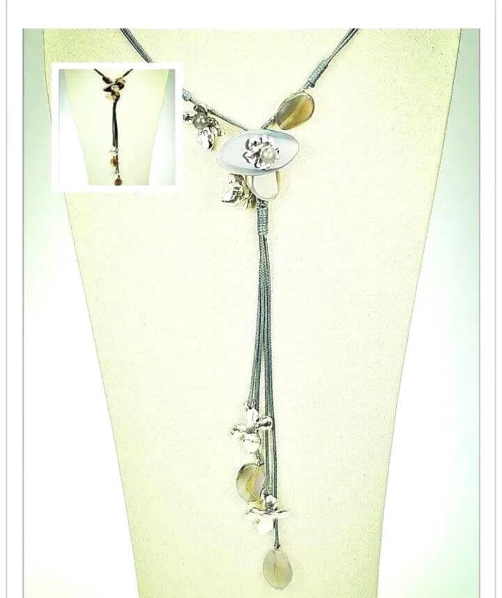 Dolga ogrlica iz več tankih kovinskih verižic v srebrnem tonu. Osrednji del sestavljajo kovinski in akrilni dekorativni elementi z visečimi obeski. Zaključek dopolnjuje podolgovat obesek iz gladkega materiala z rahlim sijajem. Materiali vključujejo kovino in akril za sodoben videz.