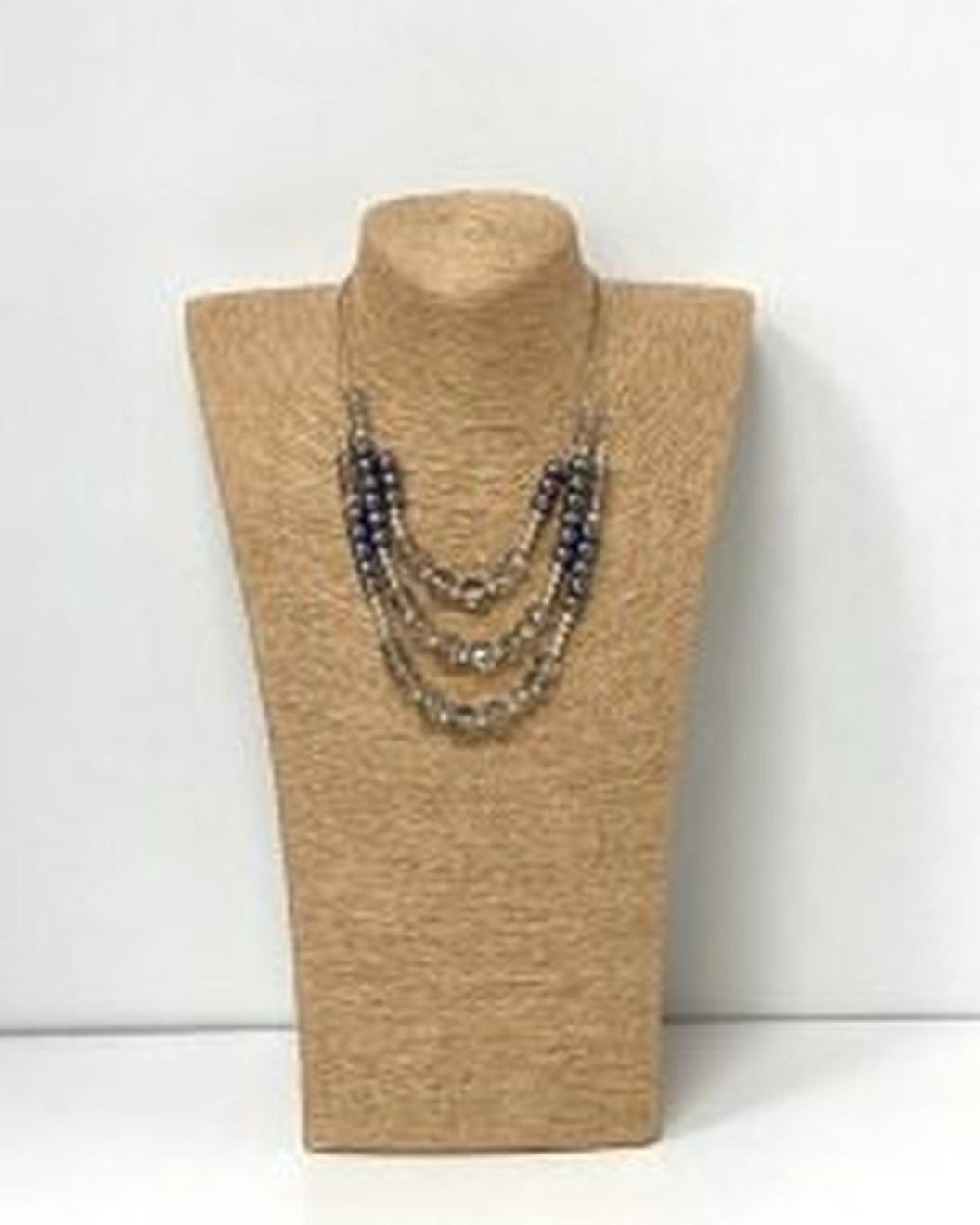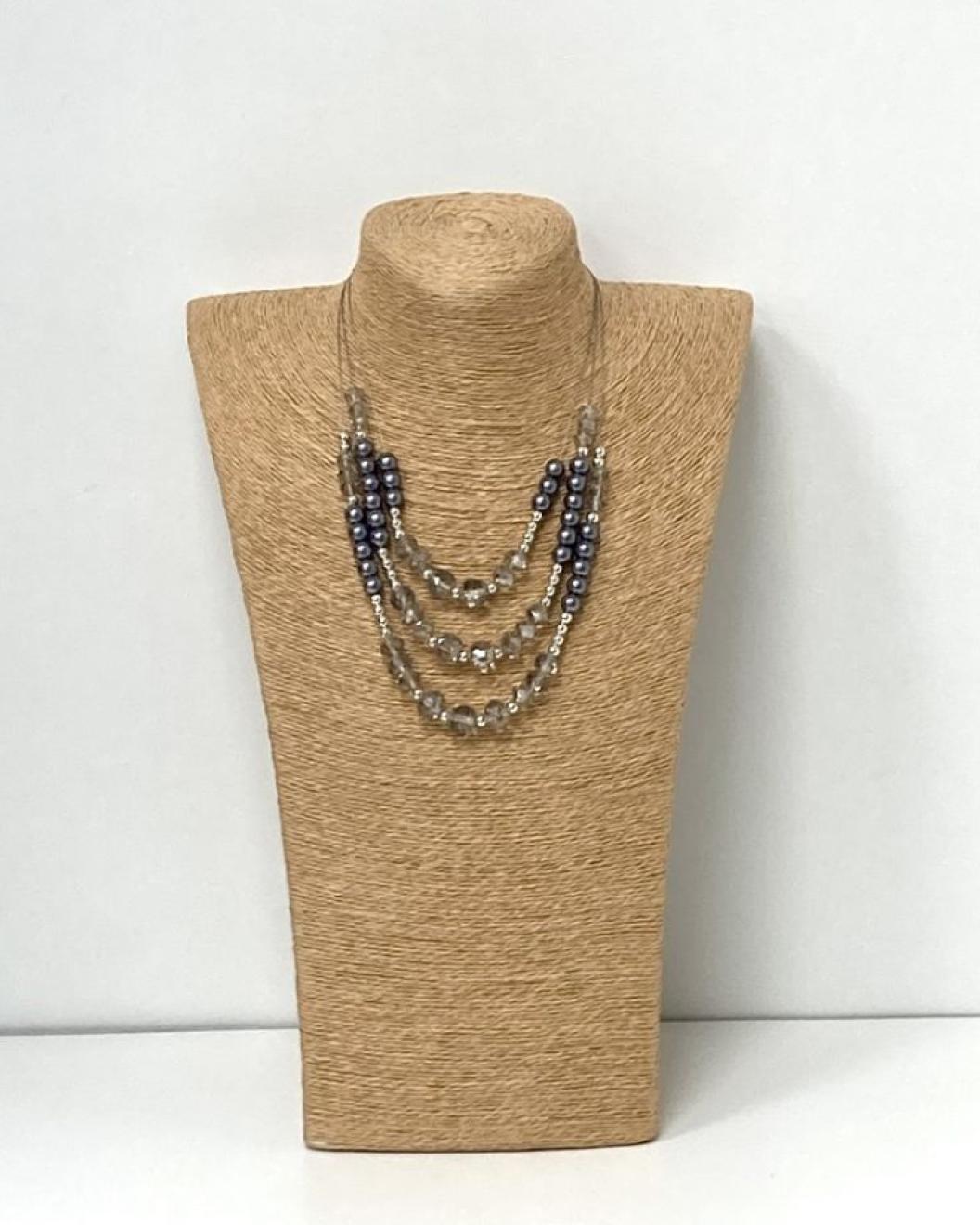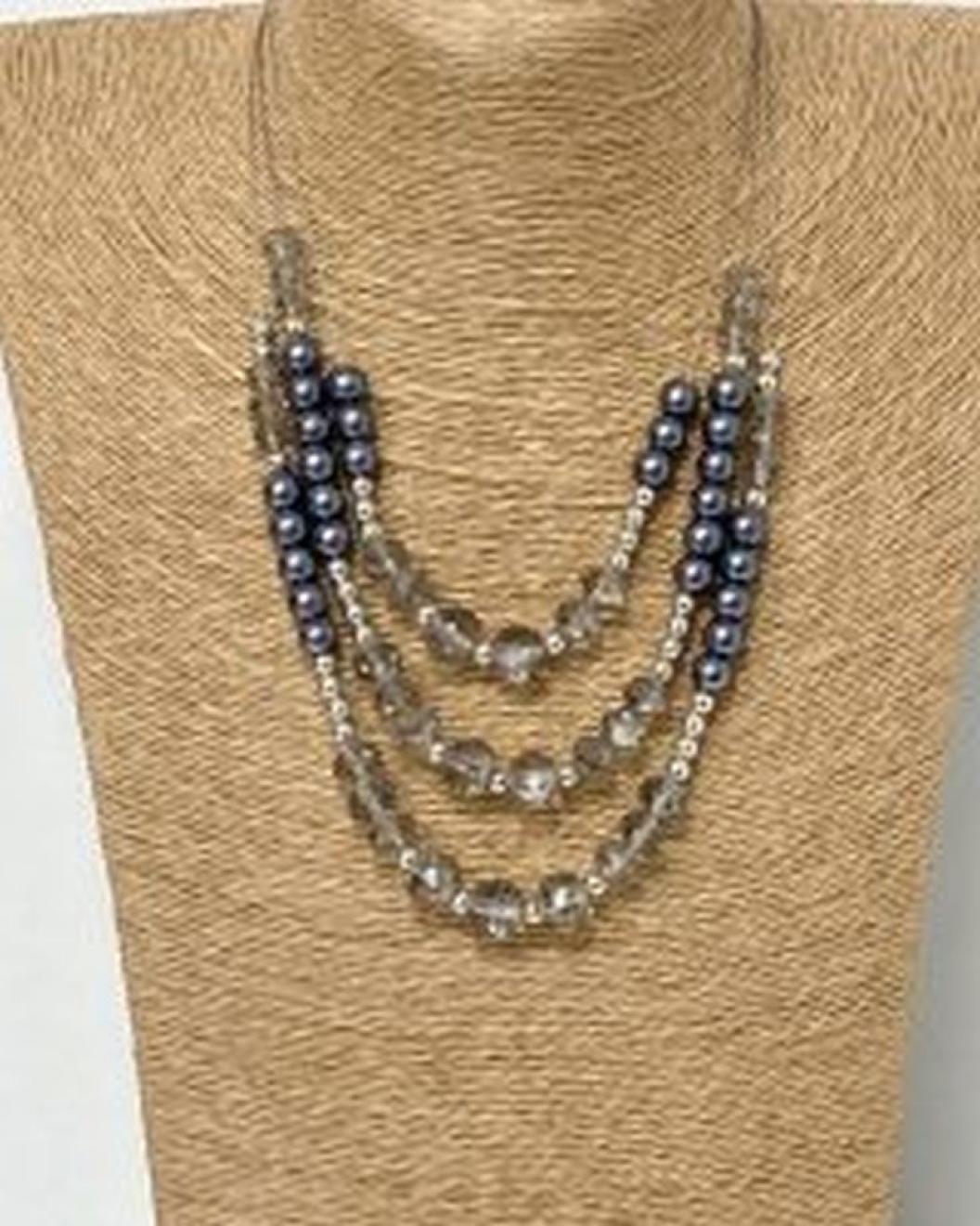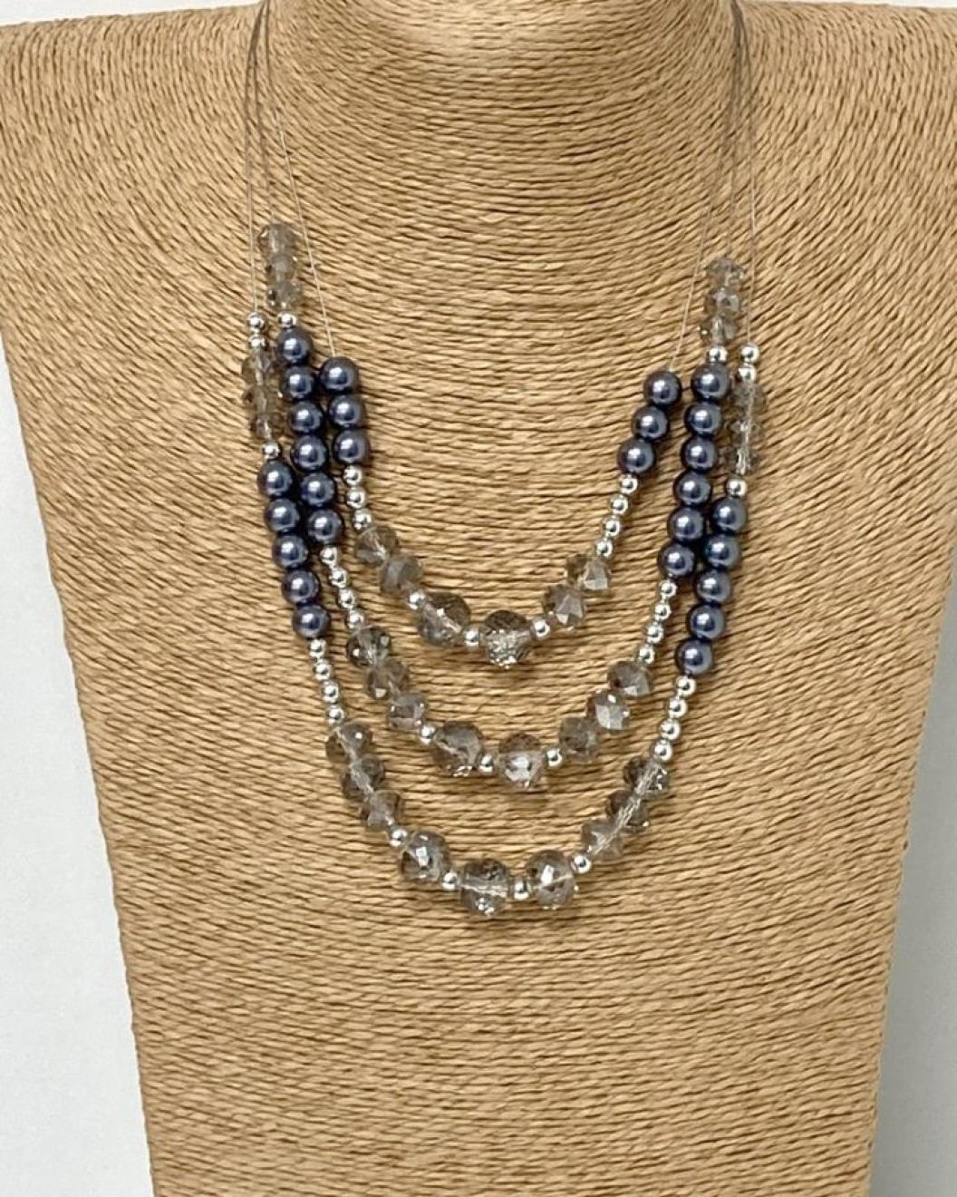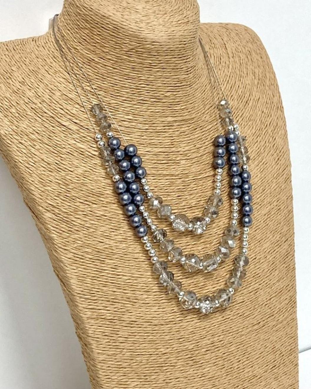Ogrlica je sestavljena iz treh vrvic na katerih so nanizani biseri in kristali v sivi, prozorni in srebrni barvi. Zapenja se na karabin v srebrni barvi.