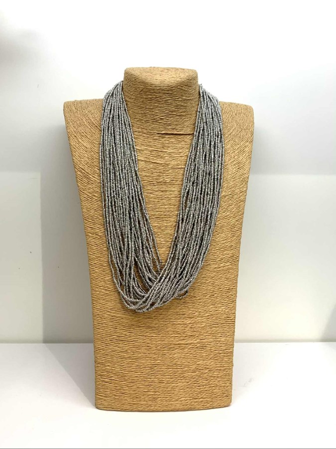 Prefinjena večvrstna ogrlica v hladnih srebrno-sivih tonih navdušuje z minimalistično eleganco in subtilnim sijajem. Drobne steklene perlice so nanizane v številne tanke niti, ki se mehko prelivajo in ustvarjajo bogat, a zadržan videz. Ogrlica je izjemno vsestranska – primerna tako za vsakodnevno nošenje kot za večerne kombinacije, kjer doda sofisticiran poudarek brez pretirane opaznosti.