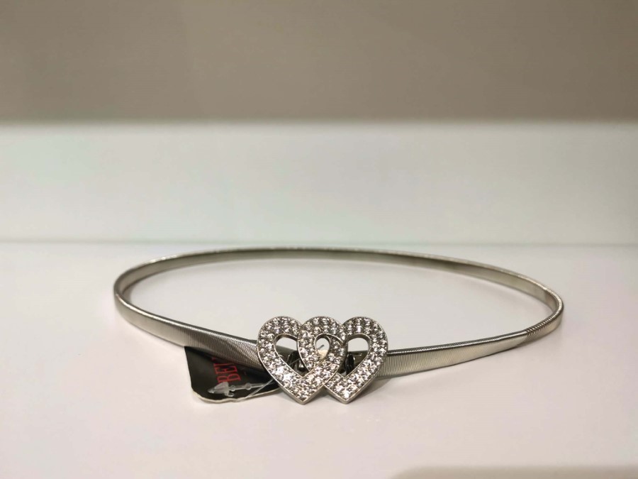 Eleganten kovinski pas s sijočo zaponko v obliki prepletenih src doda romantičen in glamurozen poudarek vsaki opravi. Minimalistična oblika v srebrnem tonu se lepo poda k oblekam, tunikam ali visokemu pasu hlač. Tanek in prefinjen dizajn poudari pas ter ustvari ženstveno silhueto. Popolna izbira za posebne priložnosti ali kot modni dodatek za vsak dan.