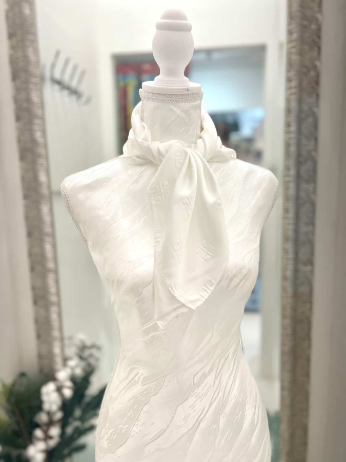 Prefinjena ruta v belem odtenku z diskretnim reliefnim vzorcem, ki doda pridih luksuza in brezčasne elegance. Svilnato gladka tkanina lepo pade in omogoča različne načine nošenja – okoli vratu, kot modni dodatek torbici ali v laseh. Popolna izbira za poslovne in posebne priložnosti ali kot sofisticiran poudarek vsakodnevnemu videzu.