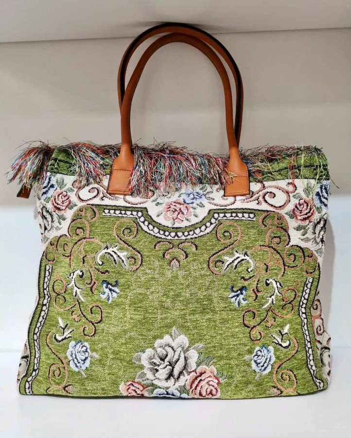 Prostorna torba z bogatim vzorcem, izdelana iz tekstilne tapiserije. Ročaji so iz kakovostnega umetnega usnja za dodatno stabilnost. Notranjost ponuja dovolj prostora za večje predmete in vsakodnevne potrebščine. Primerna je za nošenje na rami ali v roki.