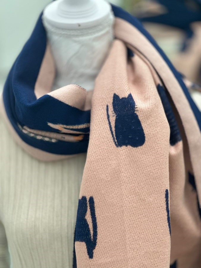 Ta prikupna šal v temno modri barvi z ljubkimi mačkami v roza oblačilih bo popestril vsak vaš outfit. Narejen je iz mehkega materiala, ki je prijeten na dotik in vas bo grel skozi hladne dni. Roza detajli na robovih in trendovske mačke dajejo šalu igriv in eleganten videz, ki je kot nalašč za vsakodnevne priložnosti ali posebne trenutke. Šal je enostaven za kombiniranje in je odlična izbira za tiste, ki želijo dodati nekaj posebnega k svojemu stilu.