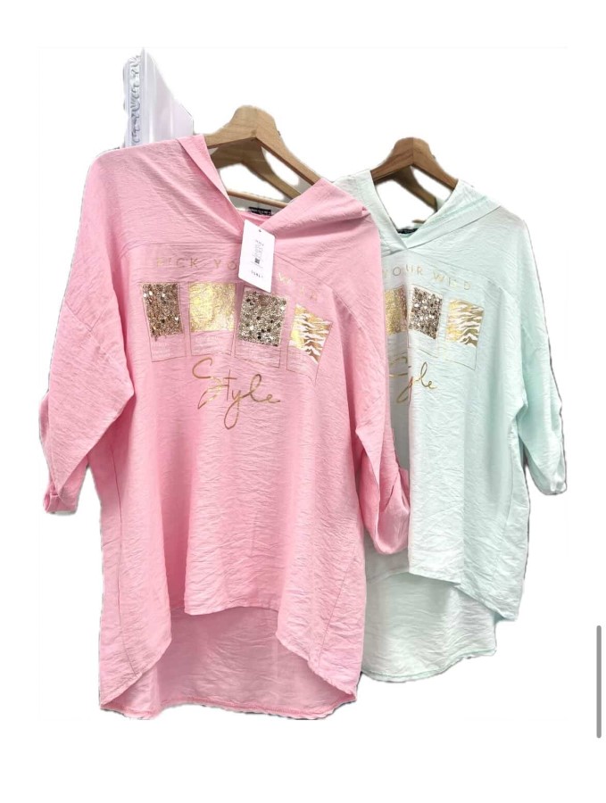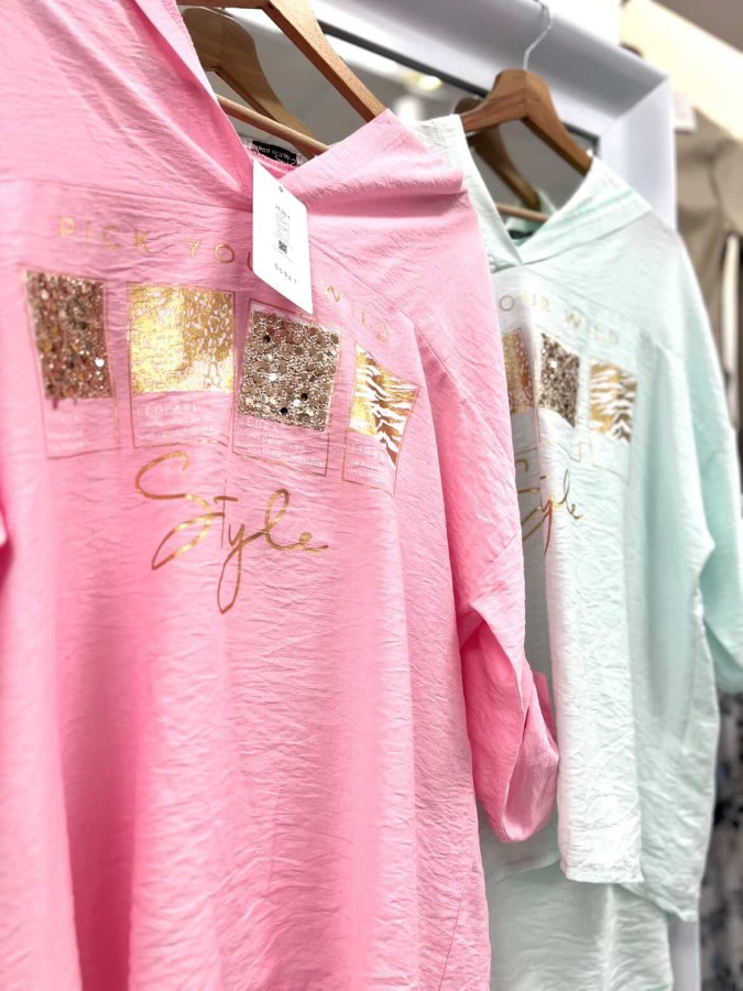 Moderna in udobna tunika, ki izstopa z elegantnim zlatim napisom na sprednji strani. Preprost kroj v kombinaciji z bleščečim detajlom ustvari popolno ravnovesje med sproščenim in trendovskim videzom.