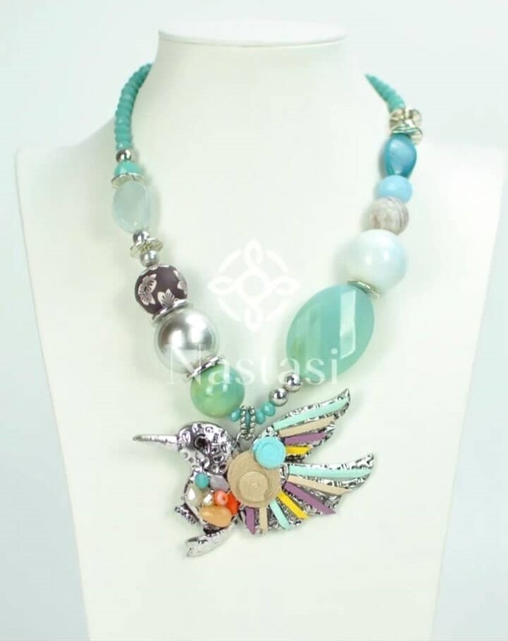 Izrazita ogrlica iz kovinske osnove, kombinirana z akrilnimi in steklenimi perlami v turkiznih odtenkih. Osrednji obesek v obliki ptice je izdelan iz kovine z barvnimi emajliranimi detajli. Dopolnjujejo jo dekorativni kovinski elementi in gladke kroglice različnih velikosti. Materiali zagotavljajo lahkotno nošenje in obstojnost.