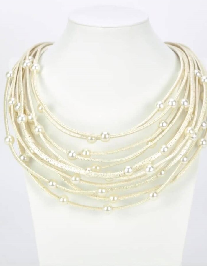 Ogrlica je oblikovana iz več tankih svetlih vrvic, ki ustvarjajo večplasten videz. Po celotni dolžini so enakomerno razporejene manjše okrogle perle bisernega videza. Material daje rahel sijaj in mehko strukturo. Zaključena je s kovinsko zaponko za enostavno zapenjanje.