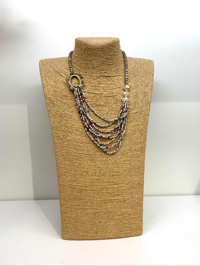 Elegantna večplastna ogrlica z drobnimi perlicami in asimetričnim poudarkom deluje lahkotno, a hkrati izrazito. Nežni zemeljski in kovinski toni so prefinjeno prepleteni v več padajočih nizov, ki lepo oblikujejo silhueto in dodajo globino vsakemu stajlingu. Poseben dekorativni element ob strani poskrbi za unikaten, ročno izdelan videz, primeren tako za vsakdan kot za posebne priložnosti.