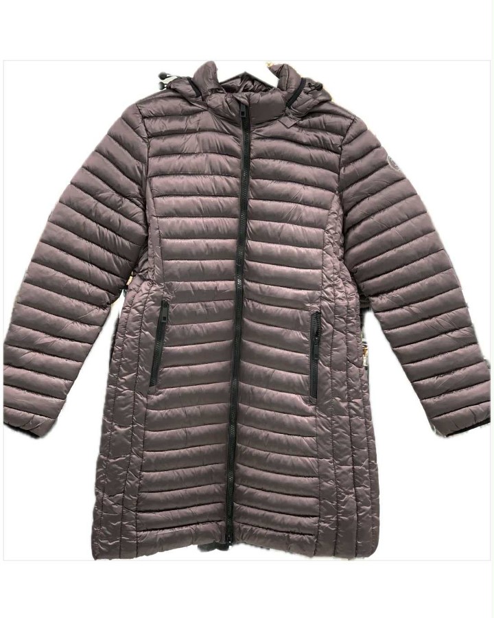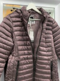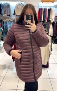 Topla, podložena ženska bunda v elegantnem vijoličnem odtenku. Ima odstranljivo kapuco z elastiko za popolno prileganje in praktične žepke na zadrgo.
