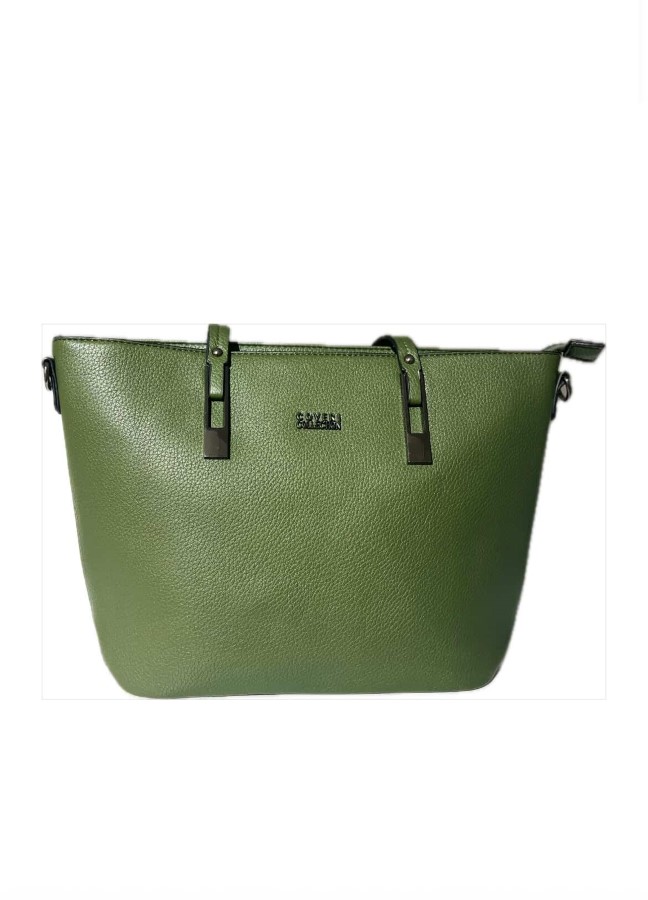 Elegantna torba v modernem olivno zelenem odtenku je popolna izbira za vsakodnevne opravke ali poslovne priložnosti. Njena minimalistična oblika in prefinjeni kovinski detajli poskrbijo za brezčasen videz. Prostorna notranjost omogoča dovolj prostora za vse vaše nujne potrebščine, hkrati pa ohranja urejen in eleganten slog. Torba je zasnovana za udobno nošenje v roki ali na rami.