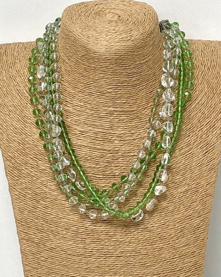 Ogrlico sestavlja več vrvic, ki imajo nanizane prozorne in zelene kristalčke različnih oblik in velikosti. Zapenja se na srebrn karabin.