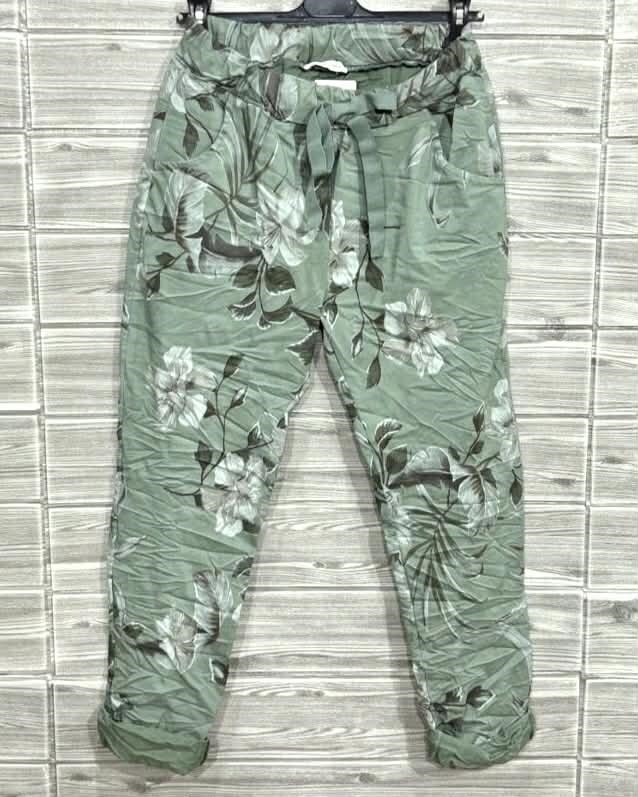 Trendovske zelene hlače z izrazitim cvetličnim motivom prinašajo svežino v vsako garderobo. Sproščen kroj in elastičen pas z vrvico poskrbita za udobno nošenje. Mehka tkanina je prijetna na dotik in primerna za celodnevne aktivnosti. Kombinirajte jih z belo majico ali jeans jakno za moderen, sproščen videz.